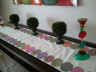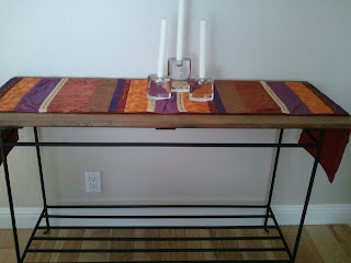 Buy on sale but splurge when you travel. I found this table runner at C&B on sale last year. I love it. I carried the candlesticks home from Amsterdam many years ago. They look like they were made for each other.