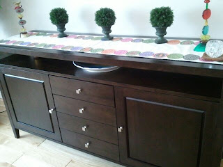 The runner is sitting atop a buffet I found on sale at Overstock.com for only $400. That sounds like a lot, until you start looking for buffets. It took my husband eight hours to put it together, but it’s pretty nice for the money. It’s not what I would choose if I were 35. But I’m not.