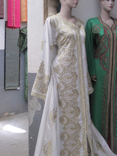 It would be worth getting married again to be able to wear this beauty of a bridal caftan, below. I have two caftans of my own at home and love the freedom of movement they afford. I wear them often around the house, but if I went to our market wearing one people would think I hadn’t gotten dressed.