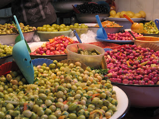 Any vegetable you might want is available, especially fava beans, artichokes and I saw a guy pushing a huge cart chock-full of garlic bulbs. By the way, the color of olives (above) reflects when they’re harvested. Green are young olives, red are harvested mid way and the black are the oldest. Things move so fast in the souk you have just a second to capture a photo and even then, if you slow down you’ll be accosted by vendors wanting to sell you something.