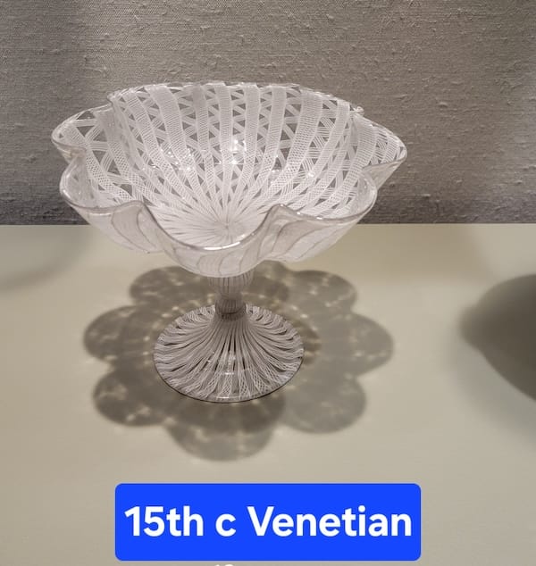 Venetian glass is by far the most delicately beautiful, at least to me. Look at the use of color–and how long ago this gorgeous goblet was made.