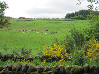 Every mile was an awe-inspiring picture: a fence with flowers growing nearby; the greenest grass and hills, mountains, really; a loch, curving gracefully in the foothills; acres of scratchy gorse and yellow broom; hedges and stone fences; cairns, gargantuan cows in brown, black, white reclining in huge pastures; sheep gamboling on hillsides, thousands upon thousands of them; goats, horses, even pigs; castles everywhere; ancient stone houses and dovecotes; a meditative maze; hundreds of thousands of acres of vast open space, green and virtually untouched for centuries.