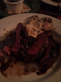 The Caesar salad we were to share appeared at the one-hour mark. It was…delicious. We had all ordered the flatiron steak. It looked beautiful on the plate, accompanied by cloves of roasted garlic, ruby chard and a few gorgonzola ravioli.