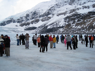 From the Icefield Centre, we took a bus to the glacier, then got on an Ice Explorer, which took us on to the glacier center. The wheels were five feet high. Same vehicle used in Antarctica. They cost almost a million dollars each, and the newest ones have wheelchair lifts. (Canada does it right.)